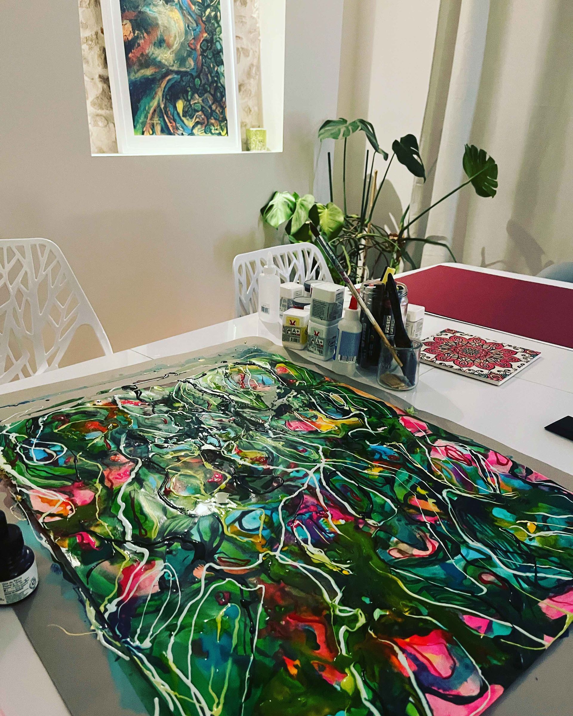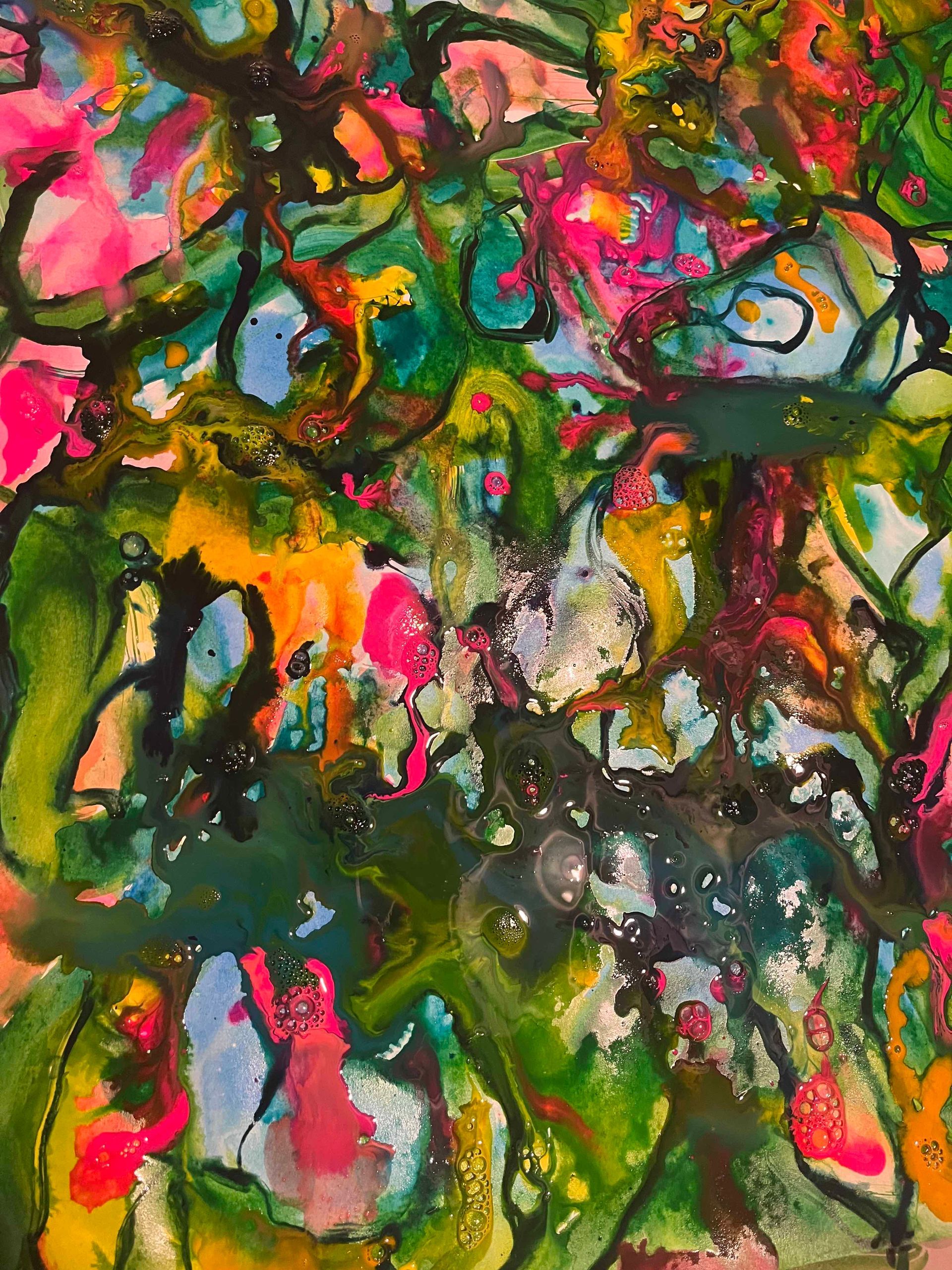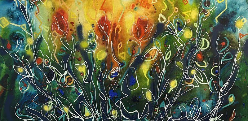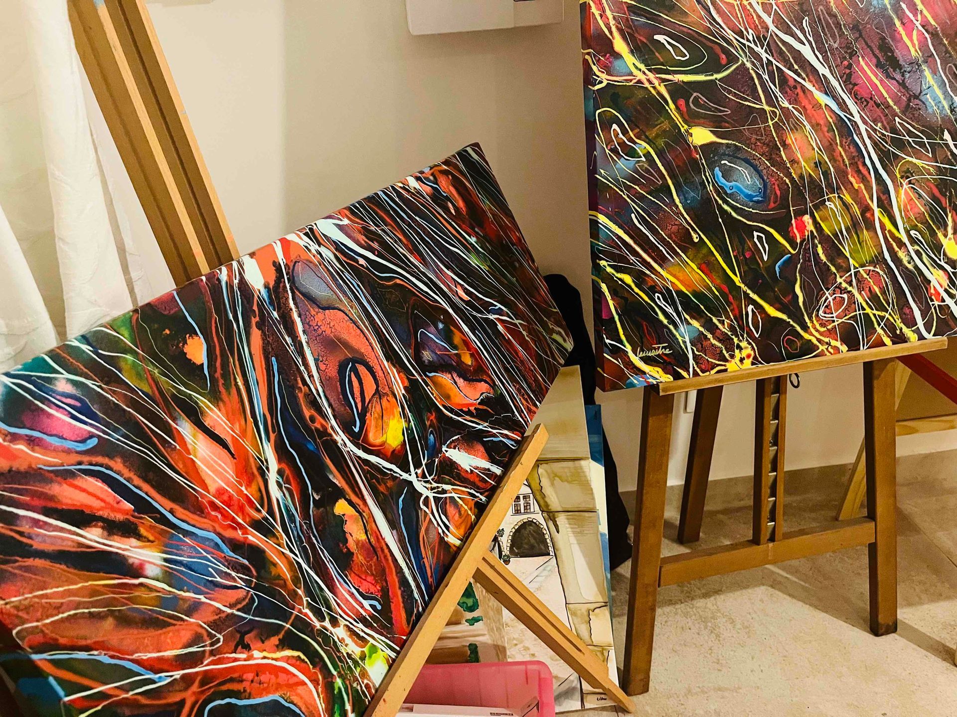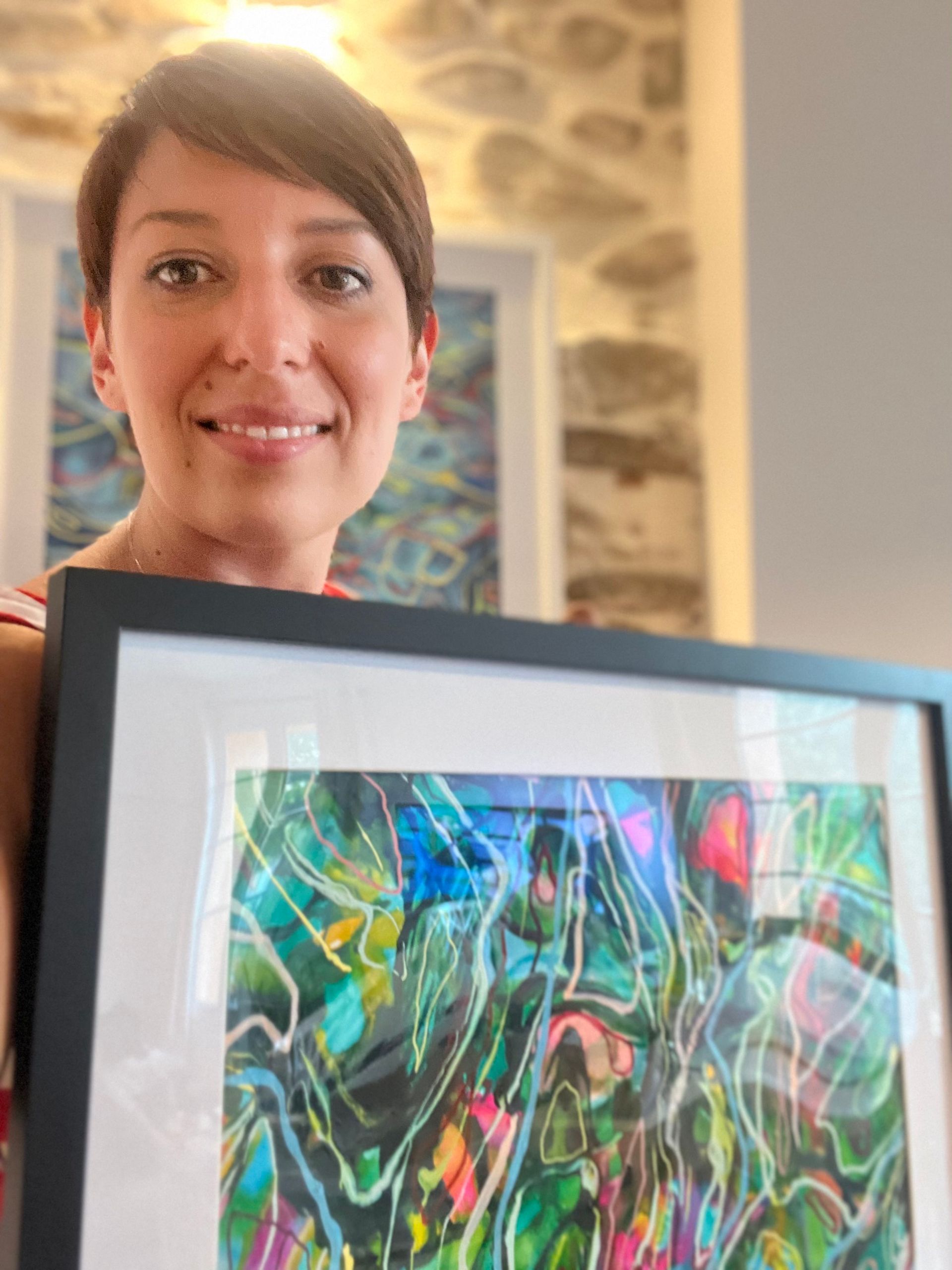 "J'ai souhaité lier l'écriture à l'art: mettre des mots sur les émotions. La série s'inspire de la nature. La résilience en est le message central. Les noeuds des arbres structurent les toiles. Mon carnet de poésie s'intitule "Balades en forêt", il fera l'objet d'une publication prochaine. Chaque poème a été spécialement créé pour une toile afin de décrire l'émotion créatrice."