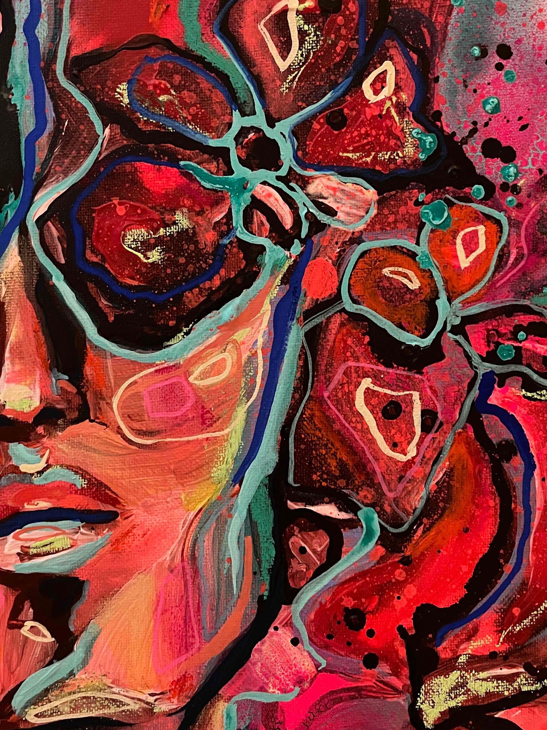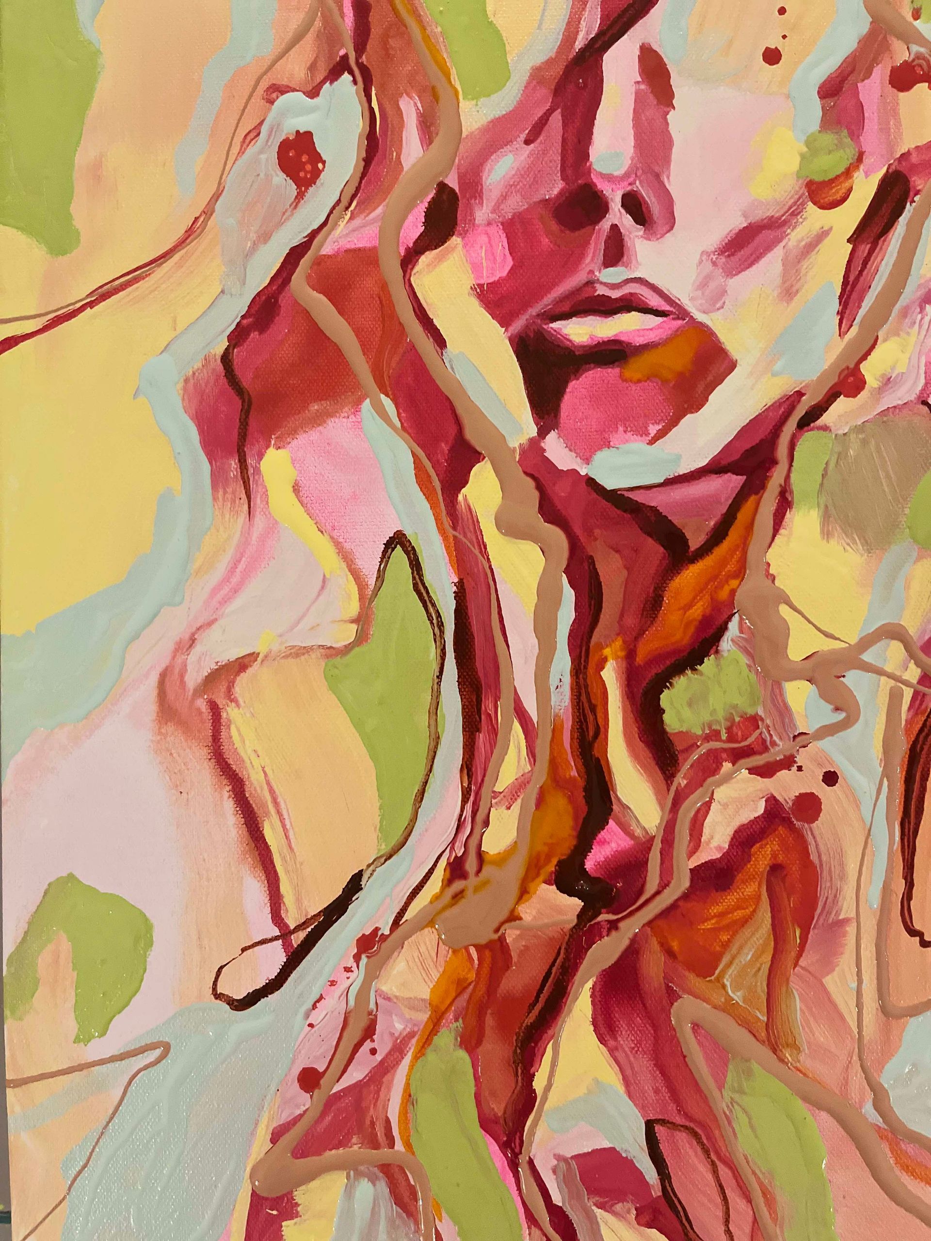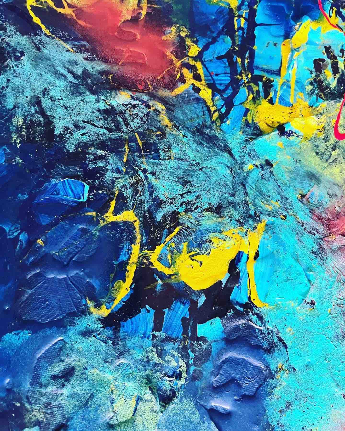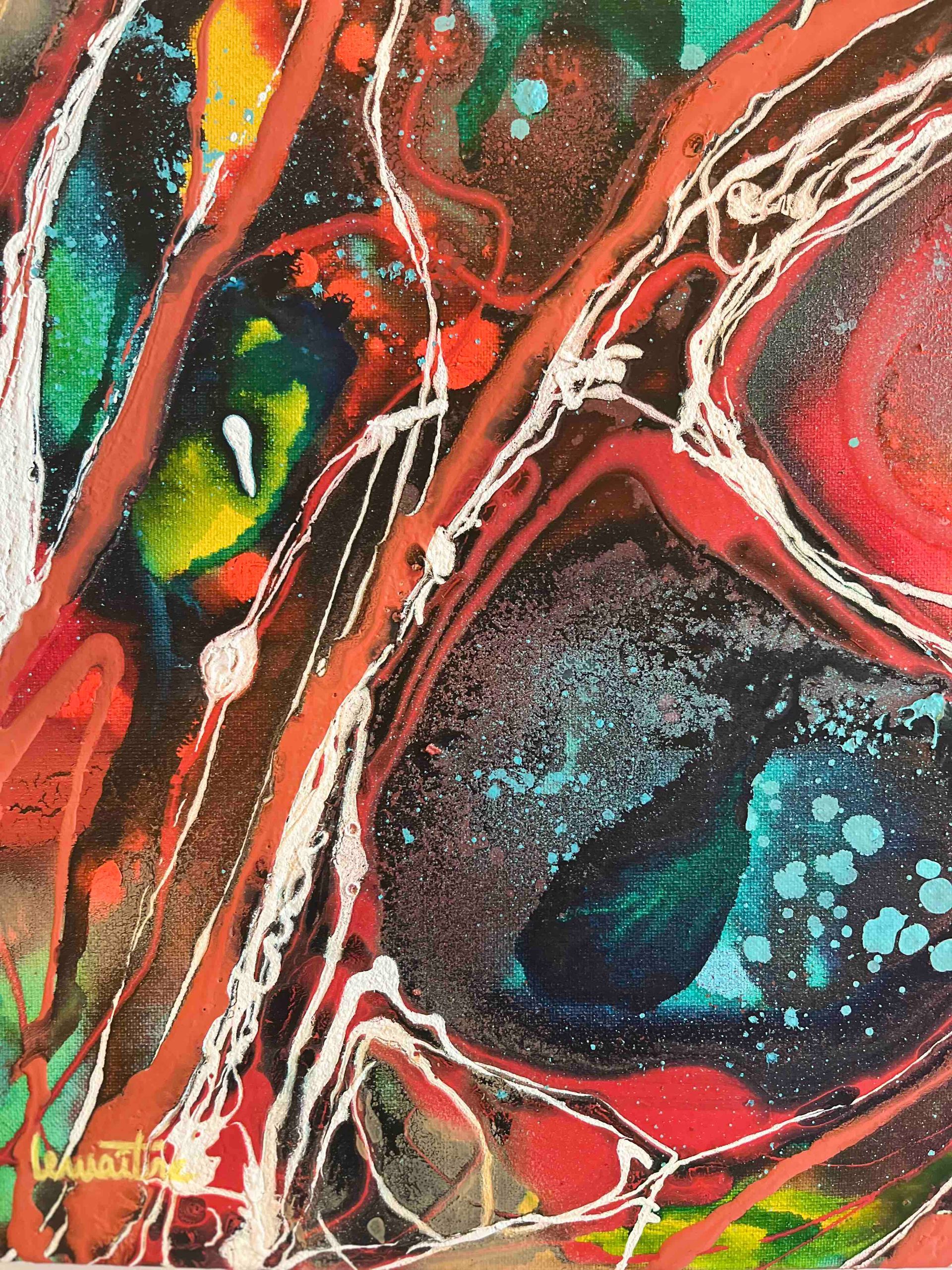 "J'ai souhaité lier l'écriture à l'art: mettre des mots sur les émotions. La série s'inspire de la nature. La résilience en est le message central. Les noeuds des arbres structurent les toiles. Mon carnet de poésie s'intitule "Balades en forêt", il fera l'objet d'une publication prochaine. Chaque poème a été spécialement créé pour une toile afin de décrire l'émotion créatrice."