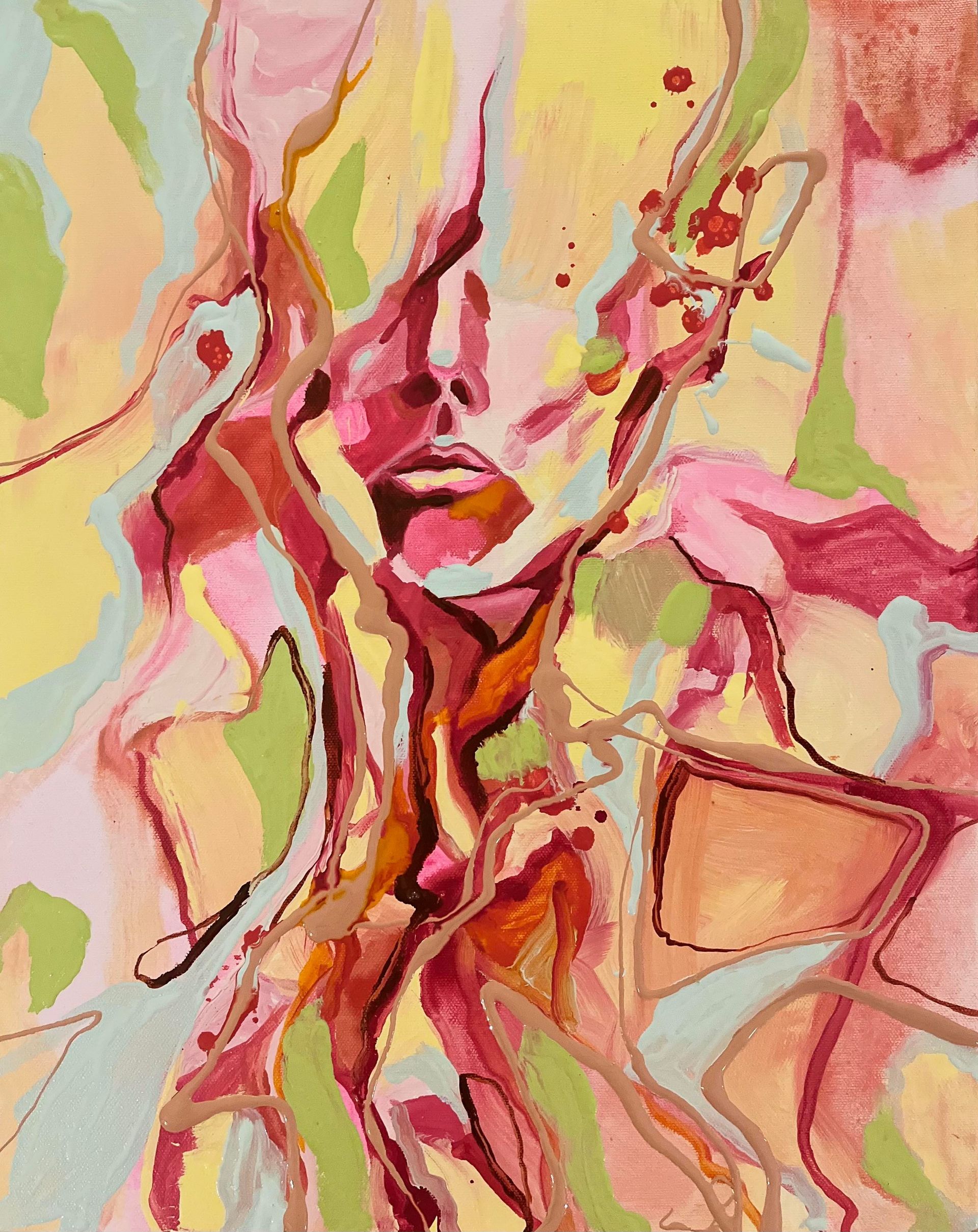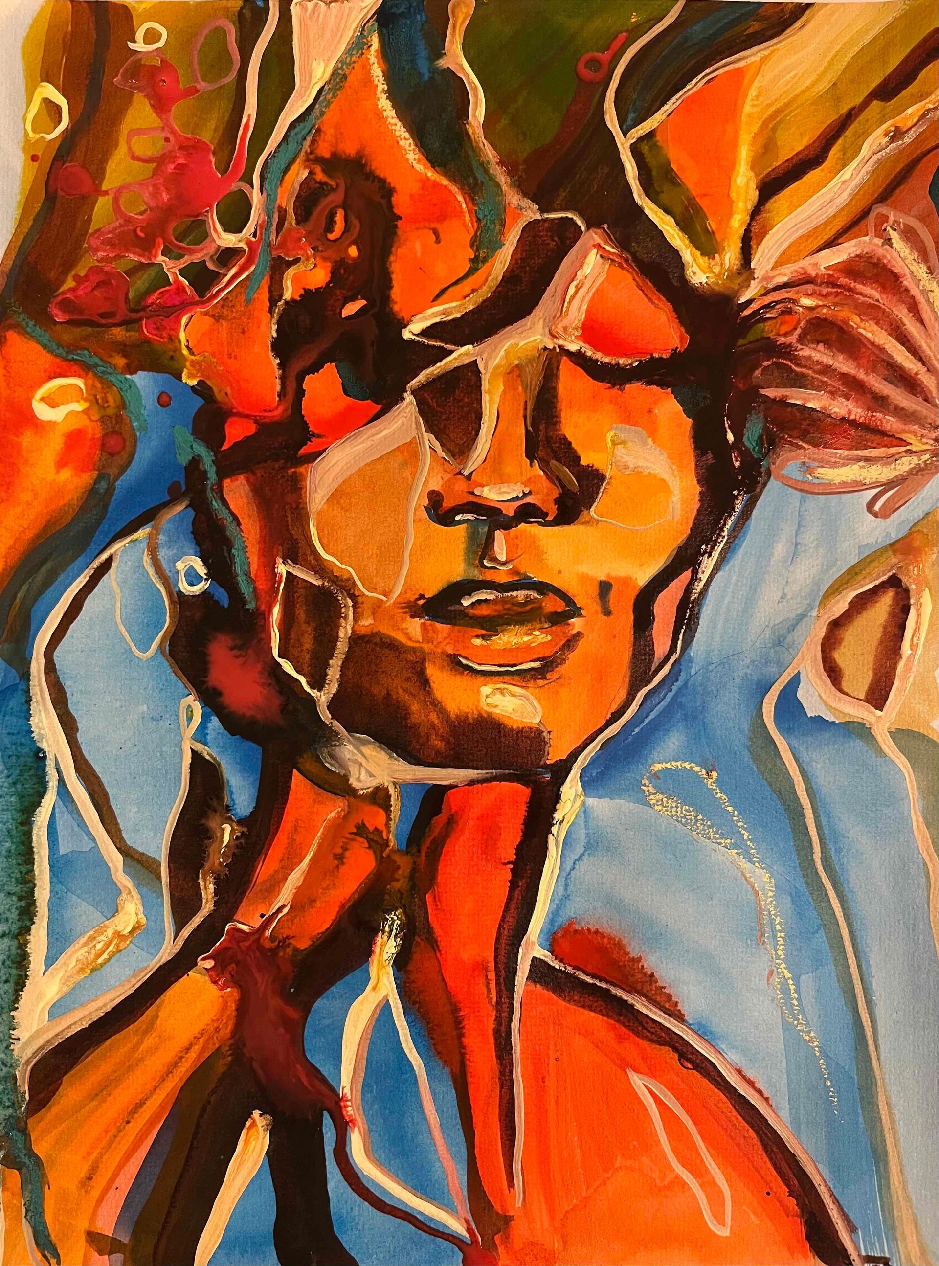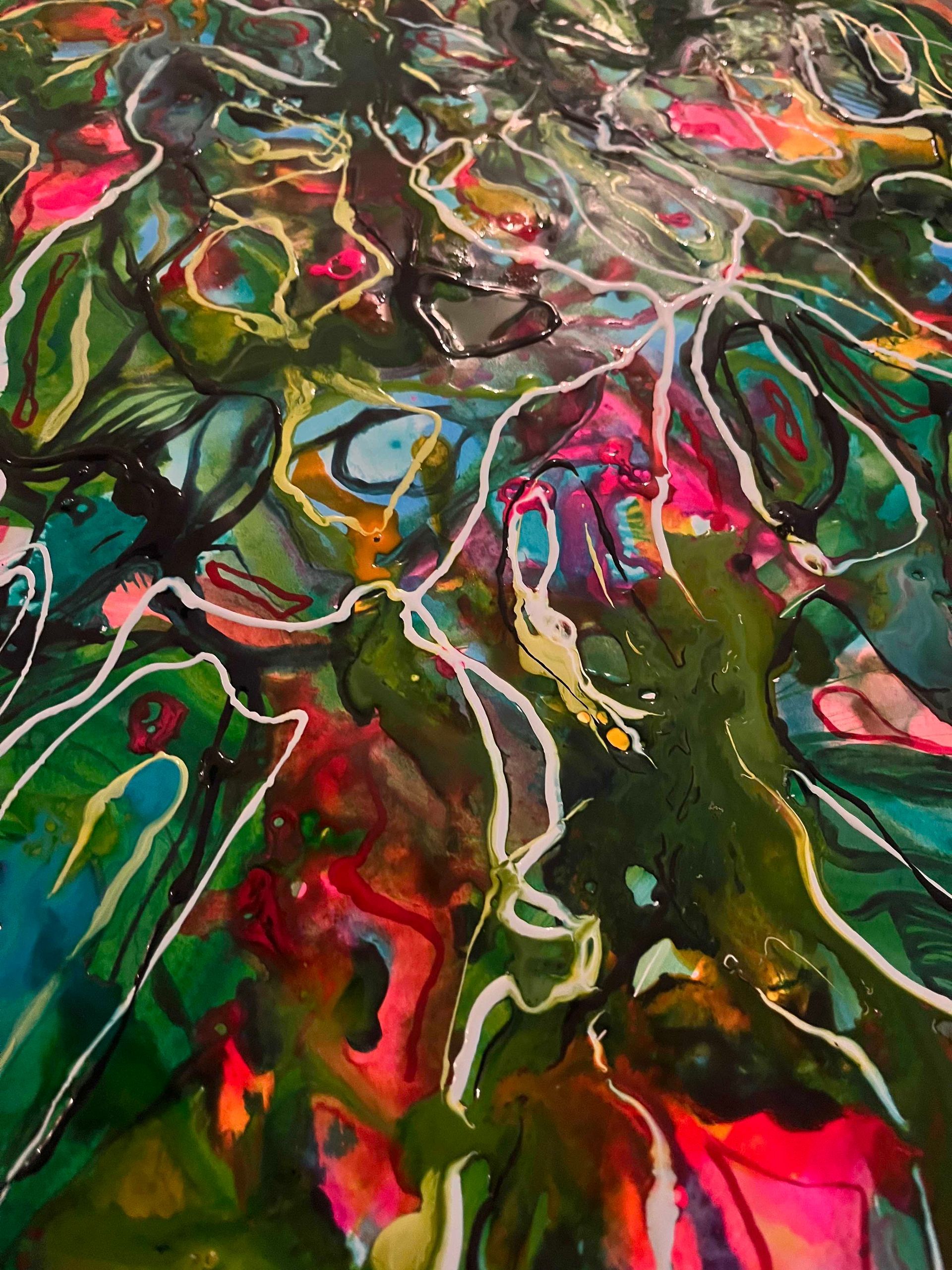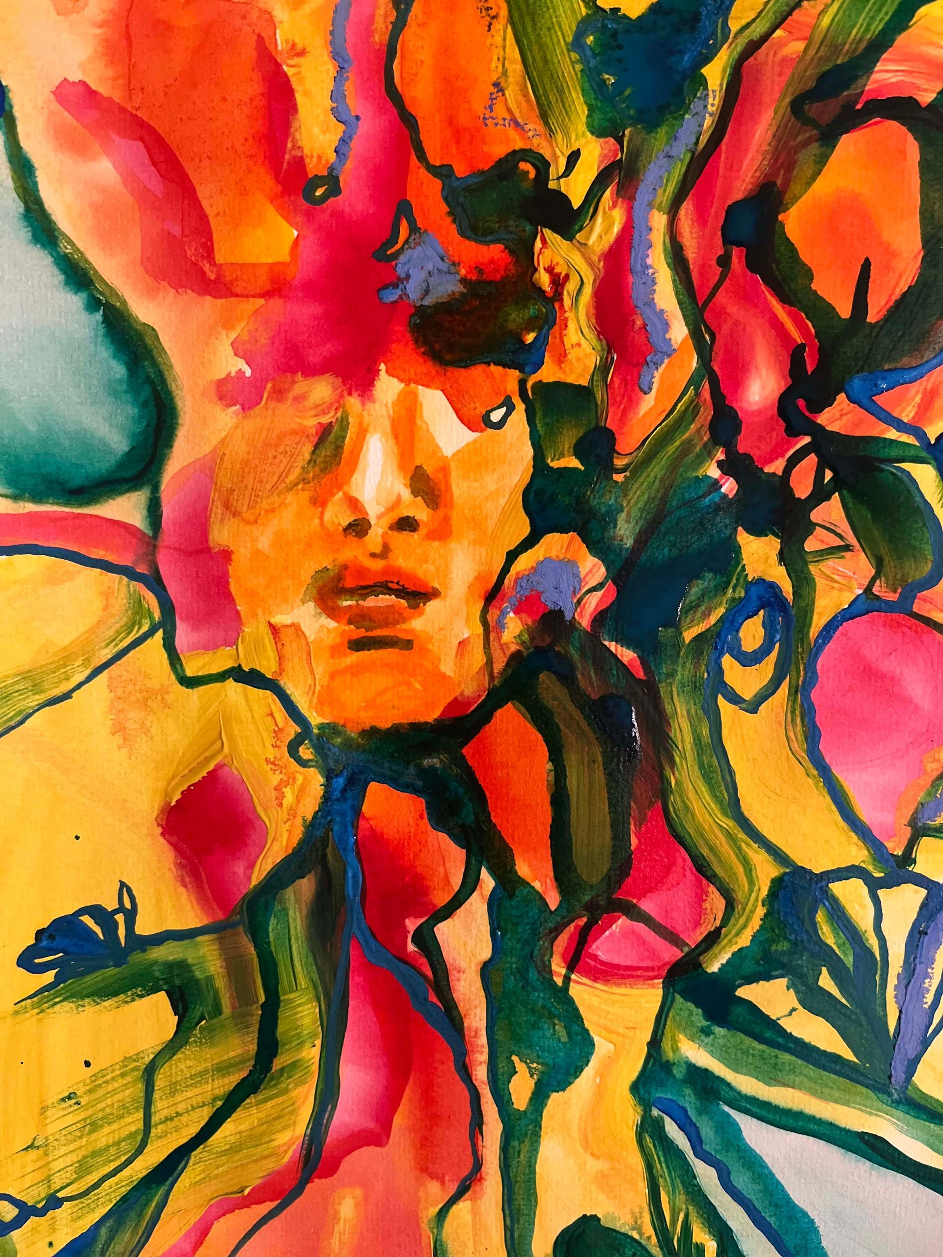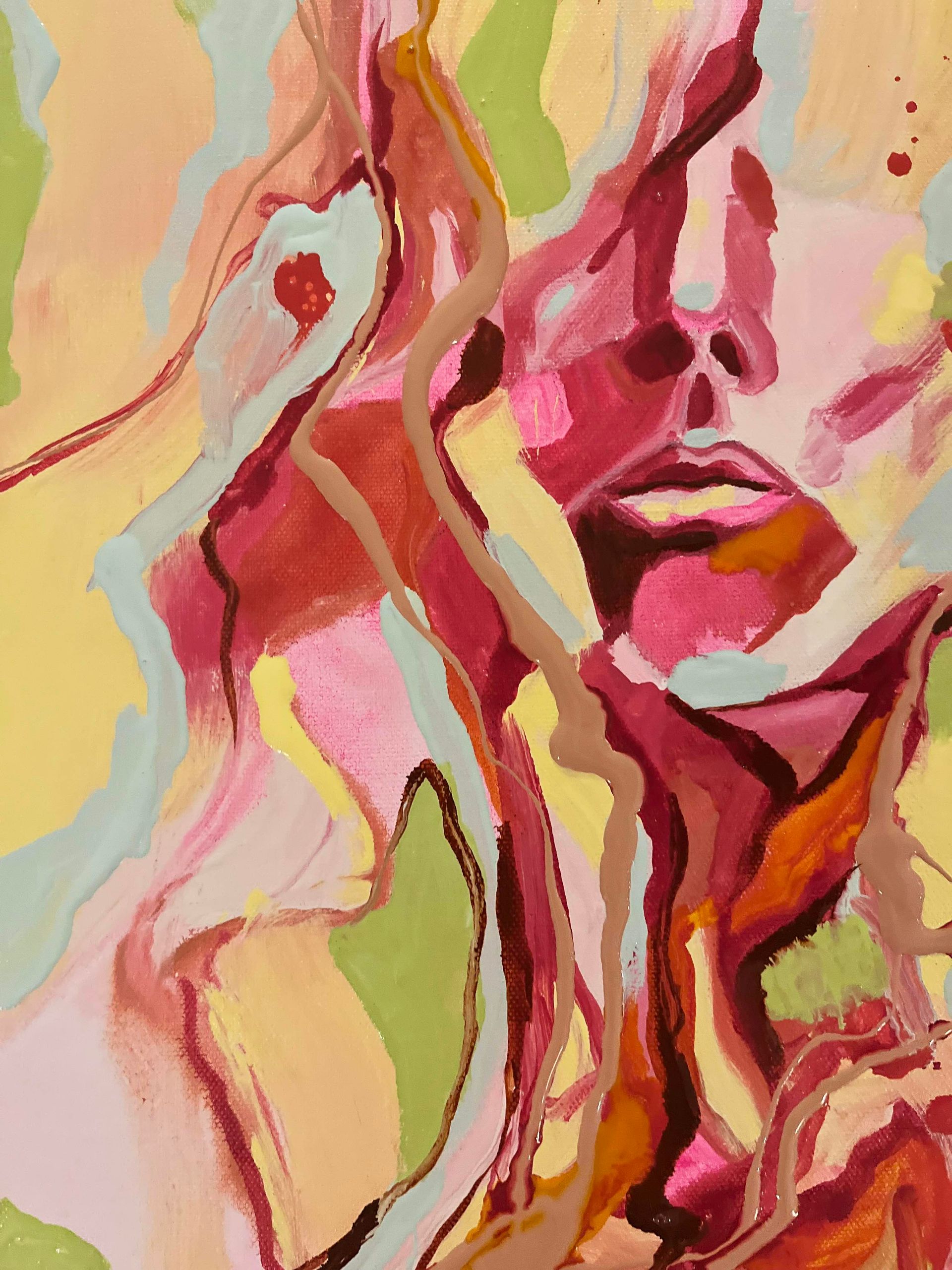 "J'ai souhaité lier l'écriture à l'art: mettre des mots sur les émotions. La série s'inspire de la nature. La résilience en est le message central. Les noeuds des arbres structurent les toiles. Mon carnet de poésie s'intitule "Balades en forêt", il fera l'objet d'une publication prochaine. Chaque poème a été spécialement créé pour une toile afin de décrire l'émotion créatrice."