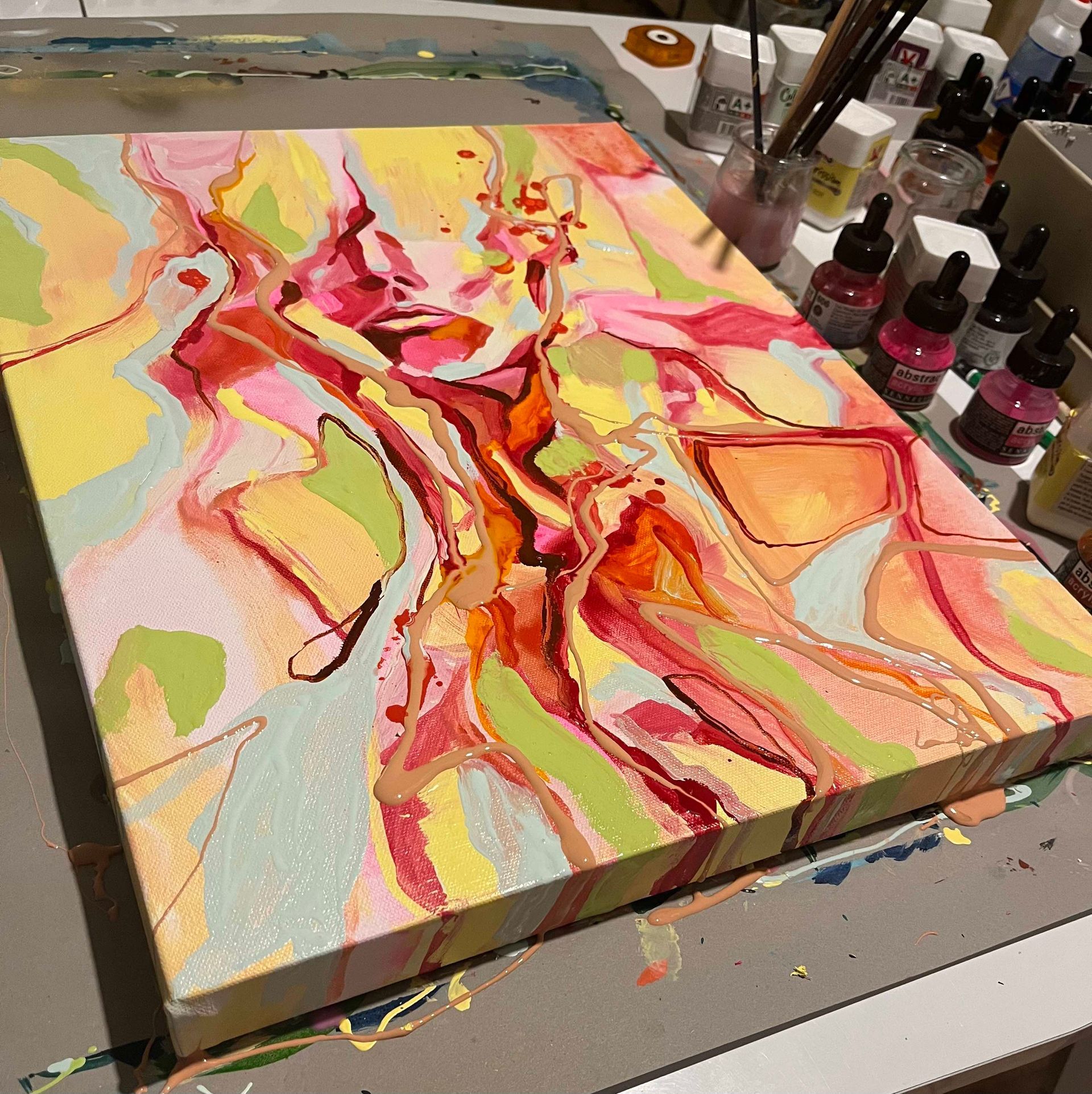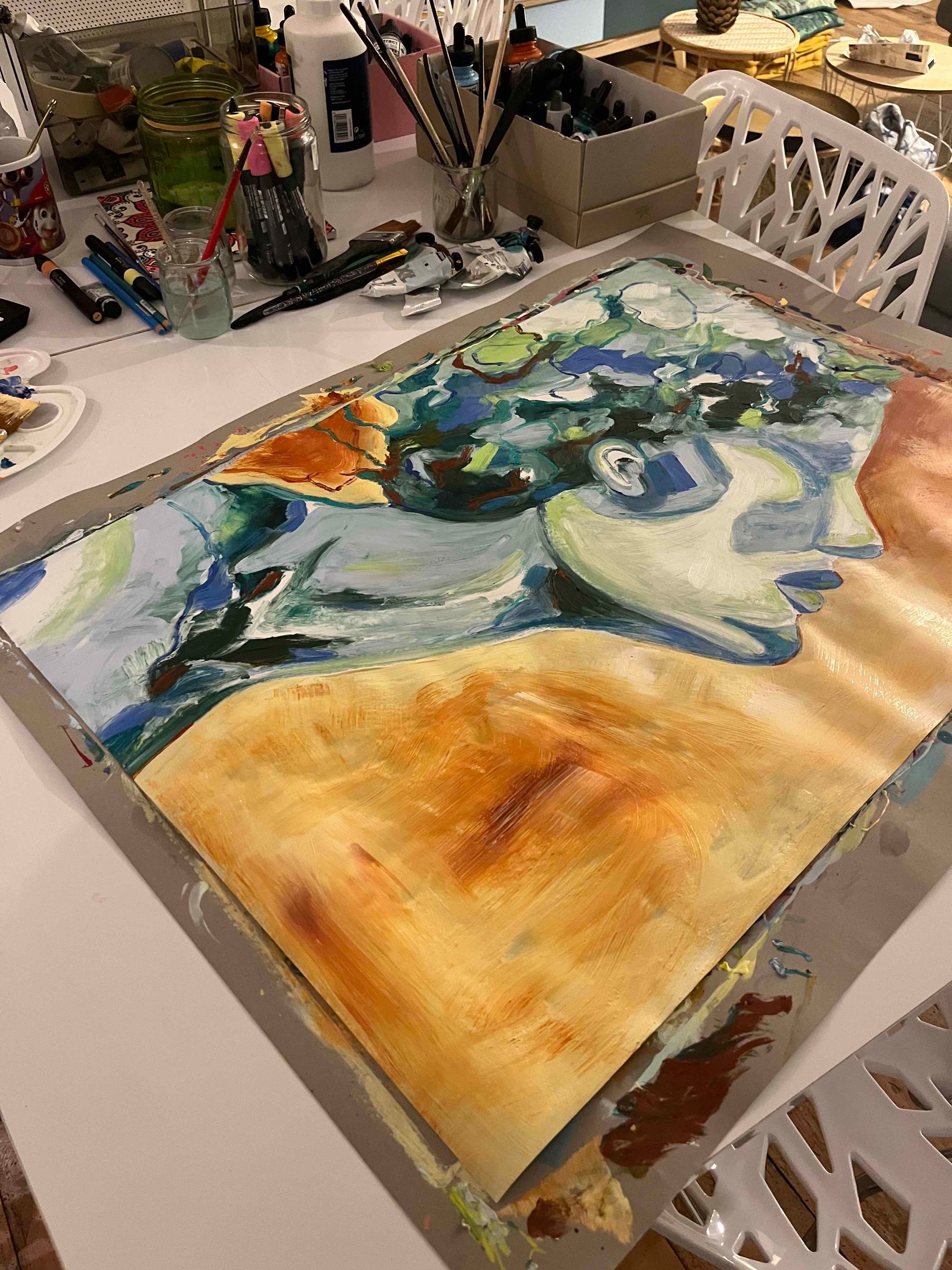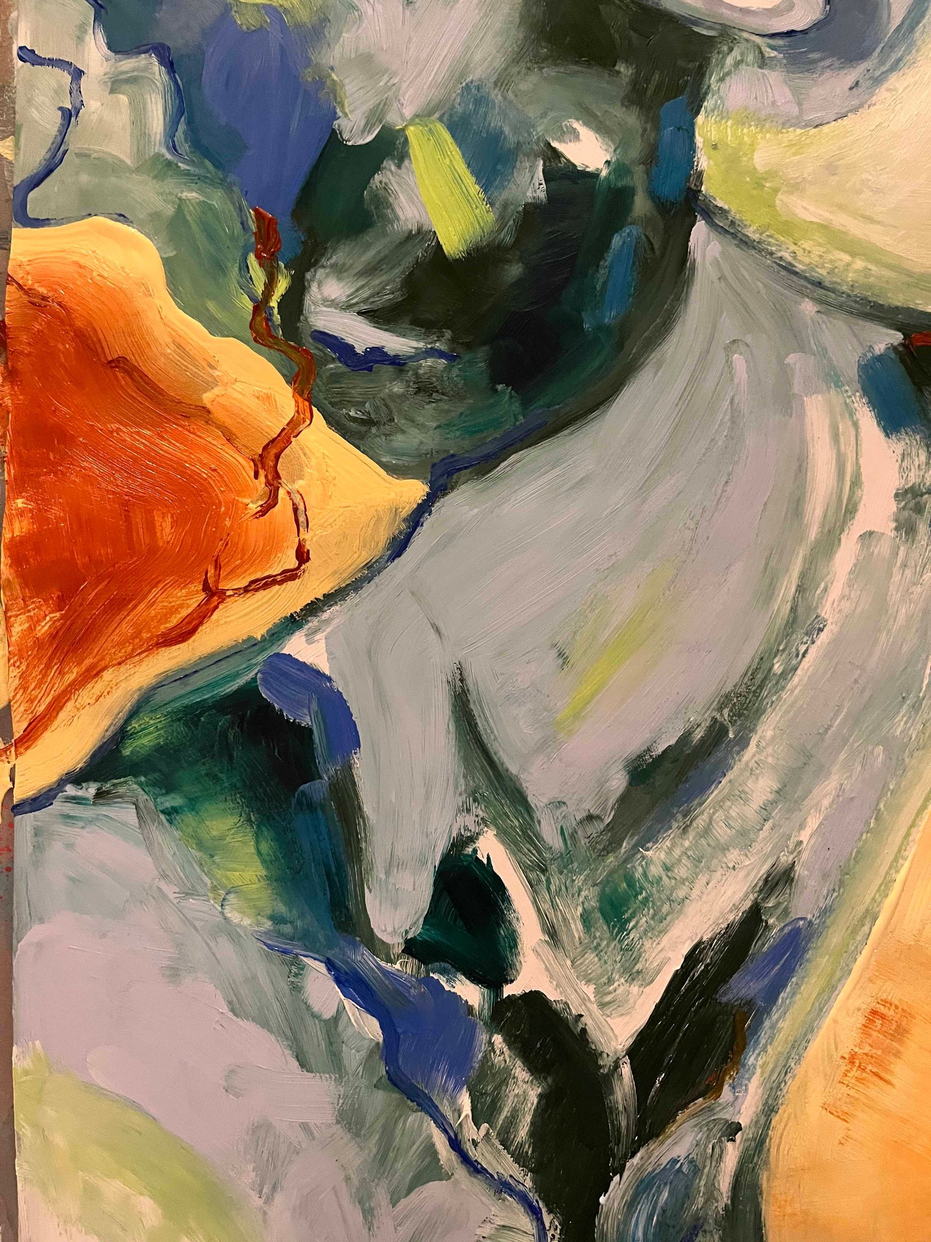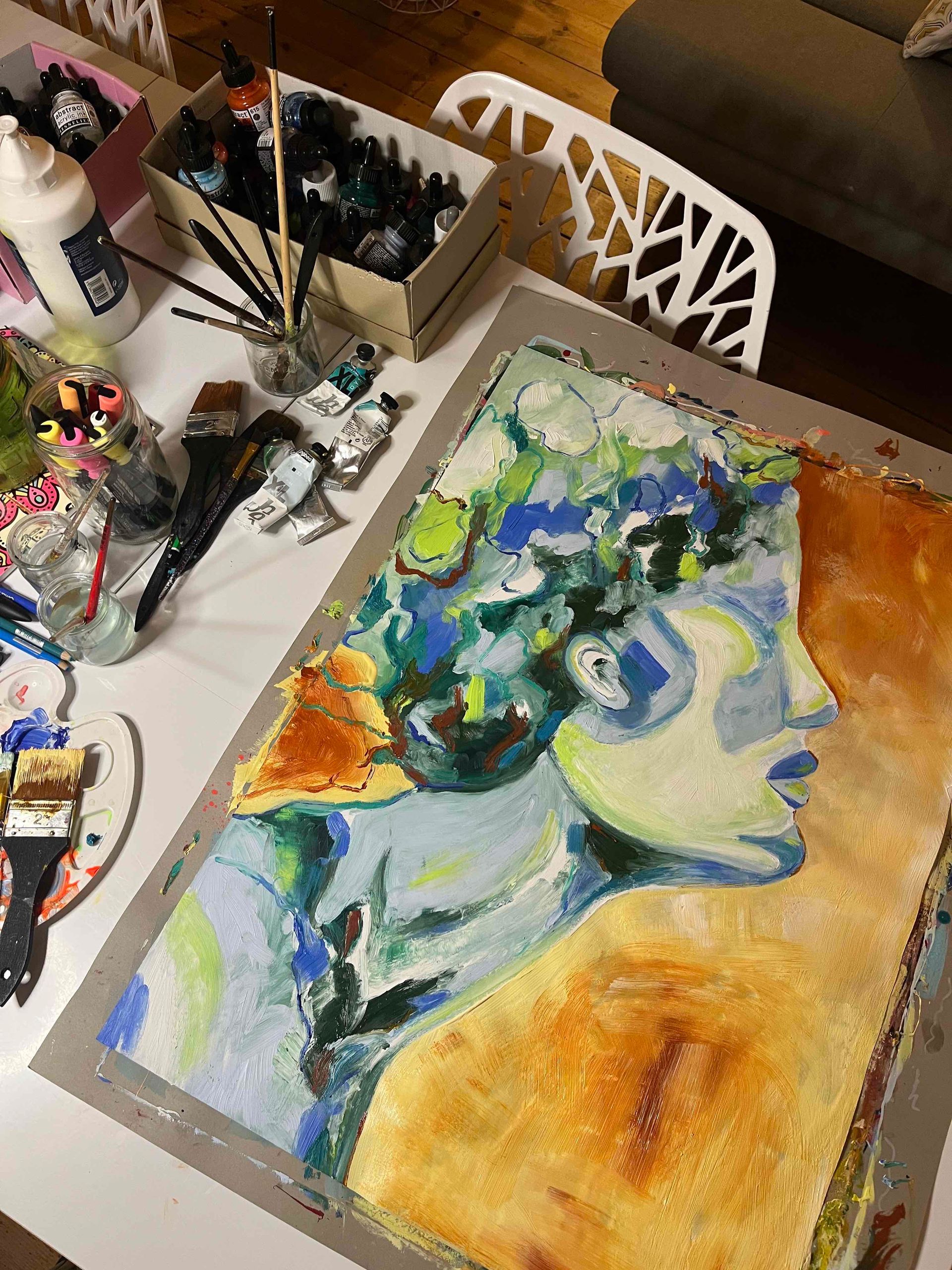 "J'ai souhaité lier l'écriture à l'art: mettre des mots sur les émotions. La série s'inspire de la nature. La résilience en est le message central. Les noeuds des arbres structurent les toiles. Mon carnet de poésie s'intitule "Balades en forêt", il fera l'objet d'une publication prochaine. Chaque poème a été spécialement créé pour une toile afin de décrire l'émotion créatrice."