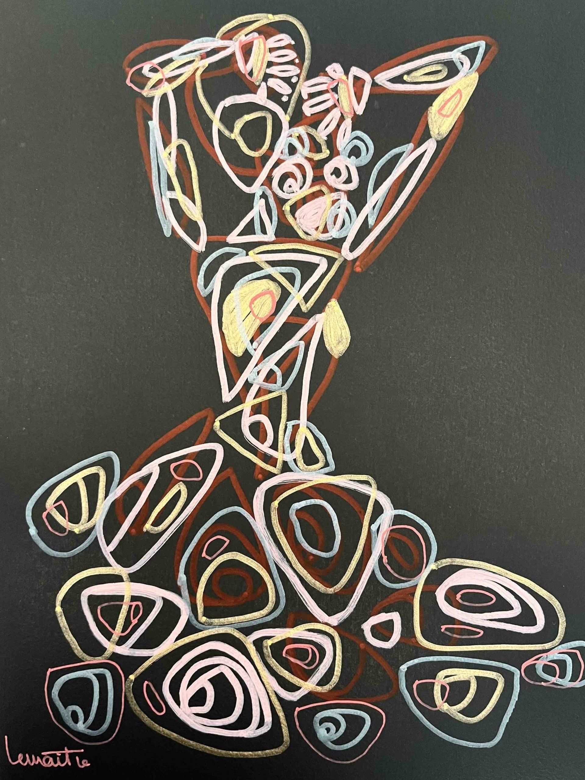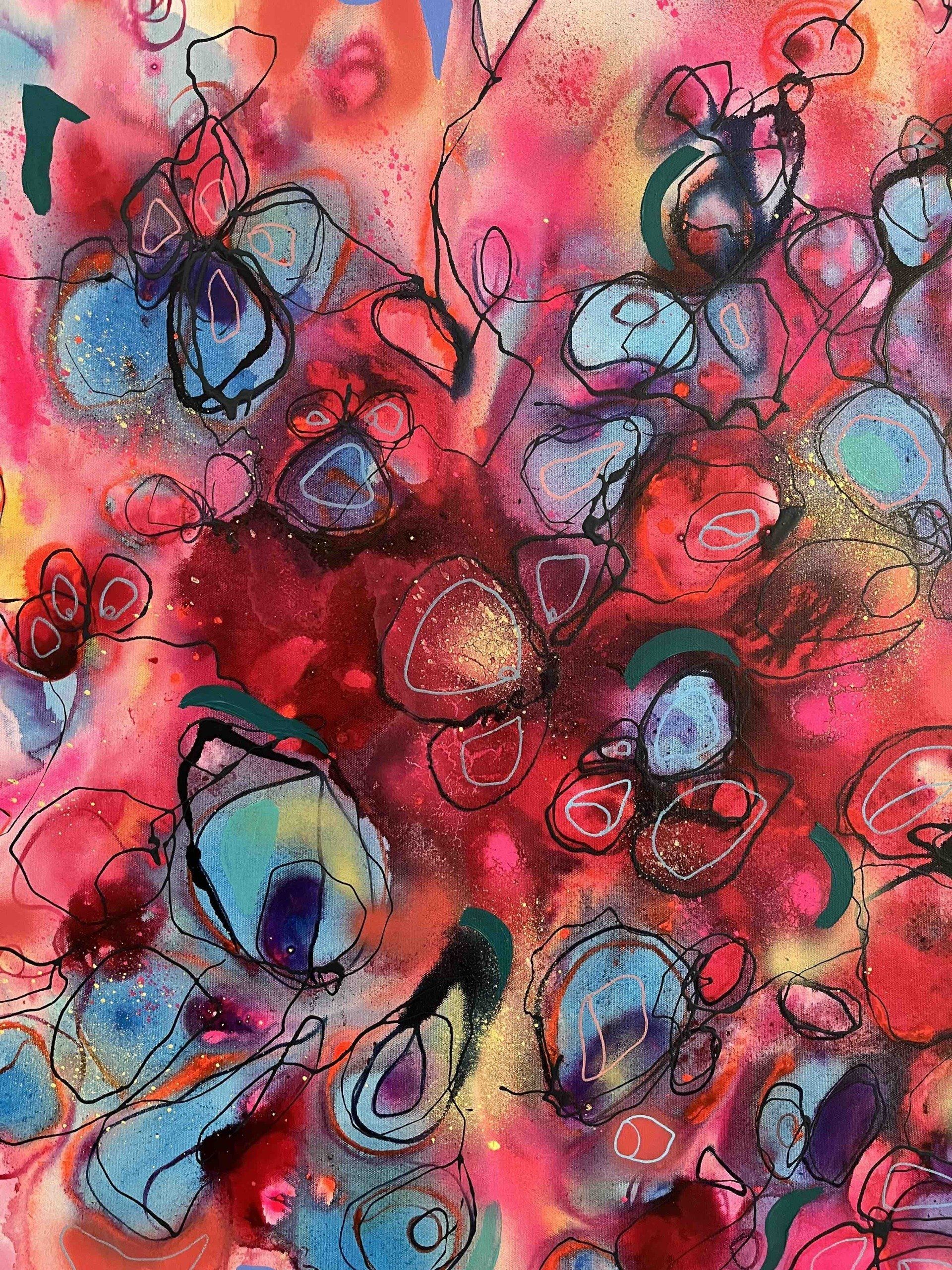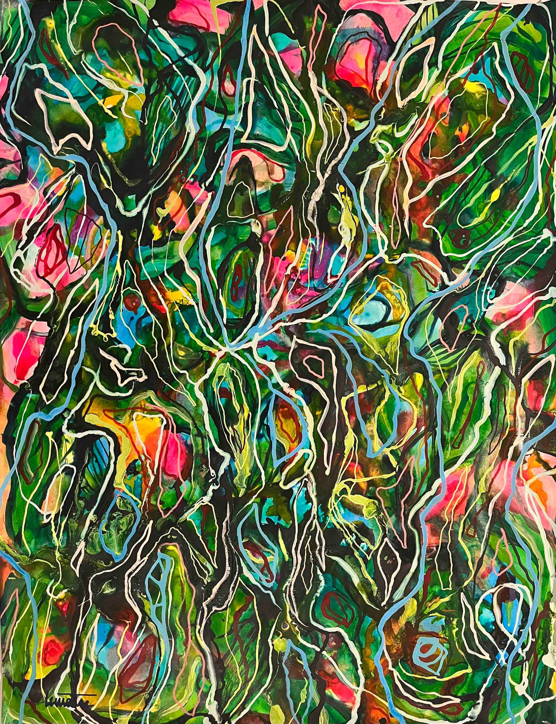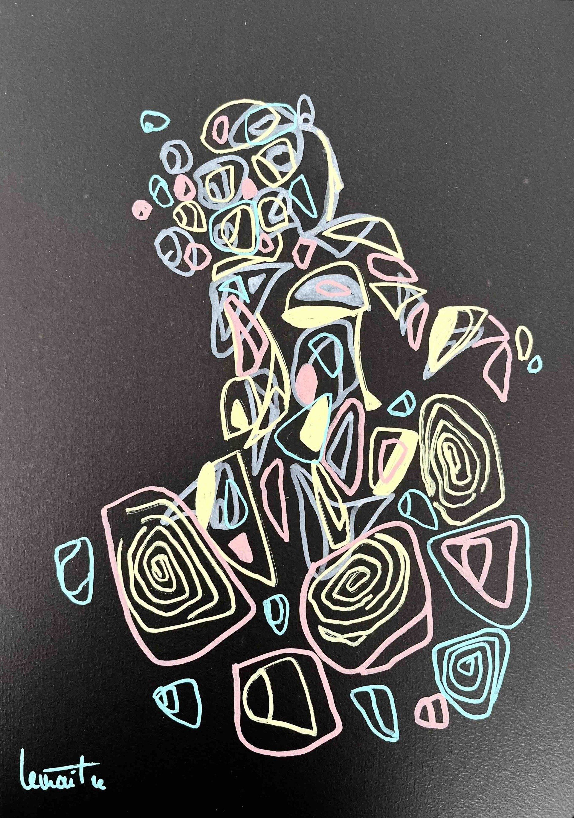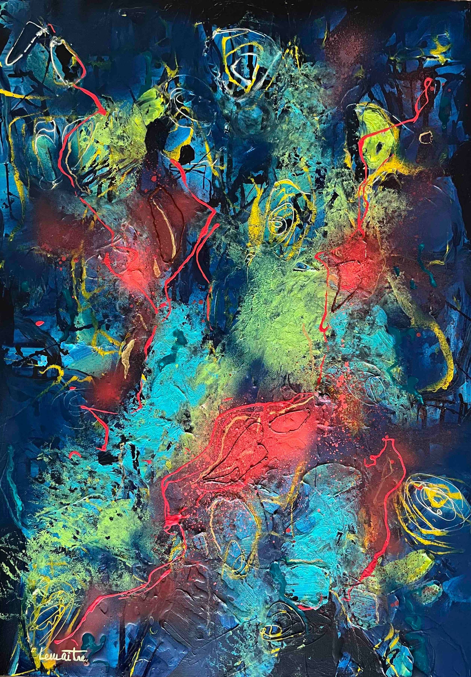 Peinture acrylique, pastels gras, secs, encres, dripping et aérosols sur Canson.